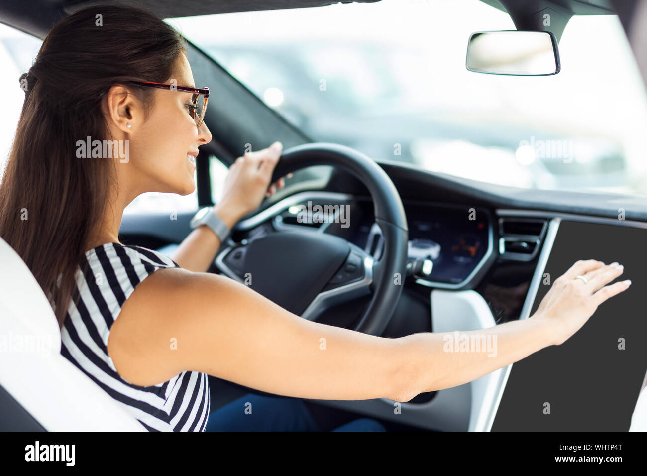Businesswoman Smiling While Driving Car In The Morning Stock Photo Alamy